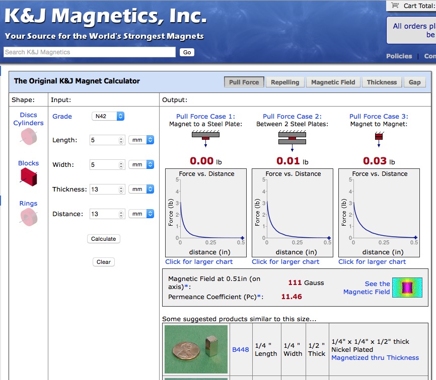Next, the info at KJ will show you how to get a feel for magnet strength, and is a source. If you do find a magnet that works, but not at 1/2", then you can use the website to get a feel for what bigger magnet you may need.