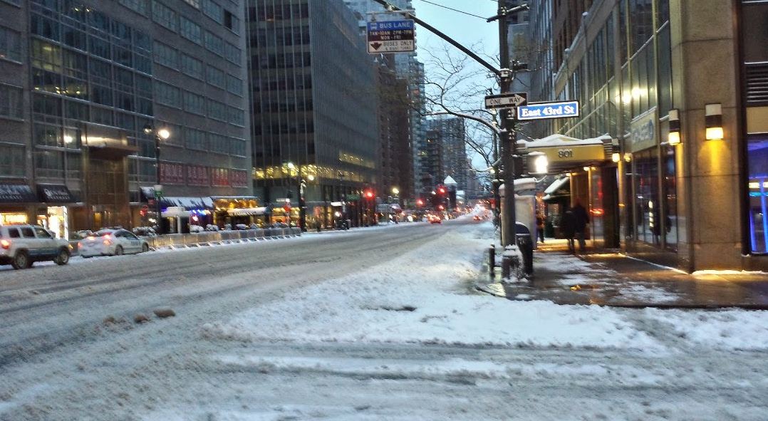 The storm wasn't nearly as bad here as some had feared. I spent the night in Manhattan, and this morning on my way into work it was slushy as hell, but we got well under a foot of snow. I'm sure the trains will be back up shortly. This is the view looking south down 2nd Ave from 43rd St: