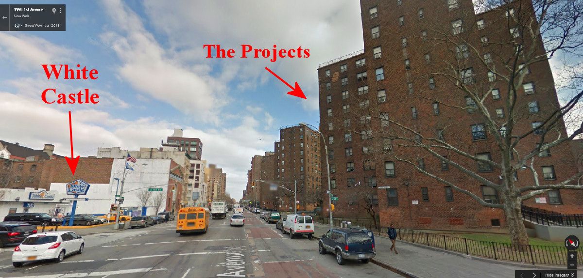 There's a White Castle on 1st Ave @ 103rd st here in Manhattan. That restaurant literally defines the southern geographical border of the ghetto which is East Harlem. I **** you not, as soon as you pass that restaurant you're immediately surrounded by public housing, hair weaves lying on the street, adults riding BMX bikes, etc.