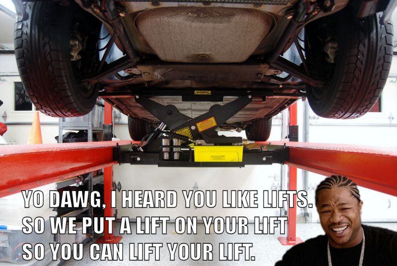 Yeah, I know you can put cross-jacks inside a 4-post lift, but this just seems silly to me when you can do the same job more easily and for less cost and floorspace with a 2-post unit.