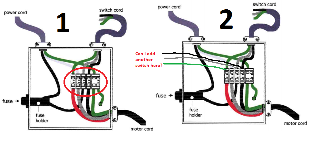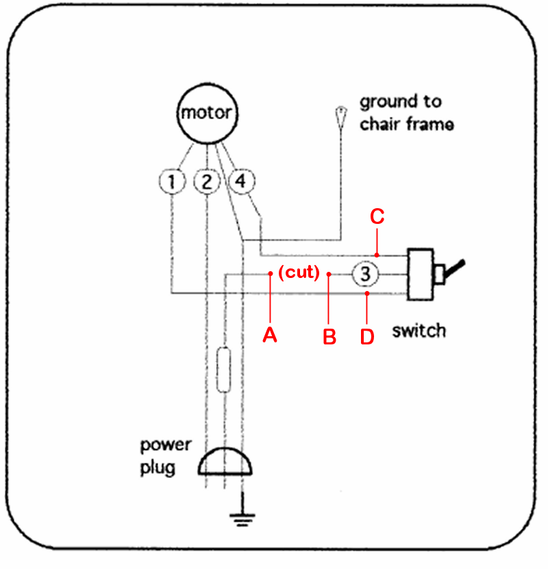 My dental chair already has a recline via a "momentary on/off/momentary on" rocker footswitch. I'd prefer to add a momentary handswitch to also control the recline. Is it as simple as adding an additional set of wires (picture #2) out of this red thing I circled in picture #1?