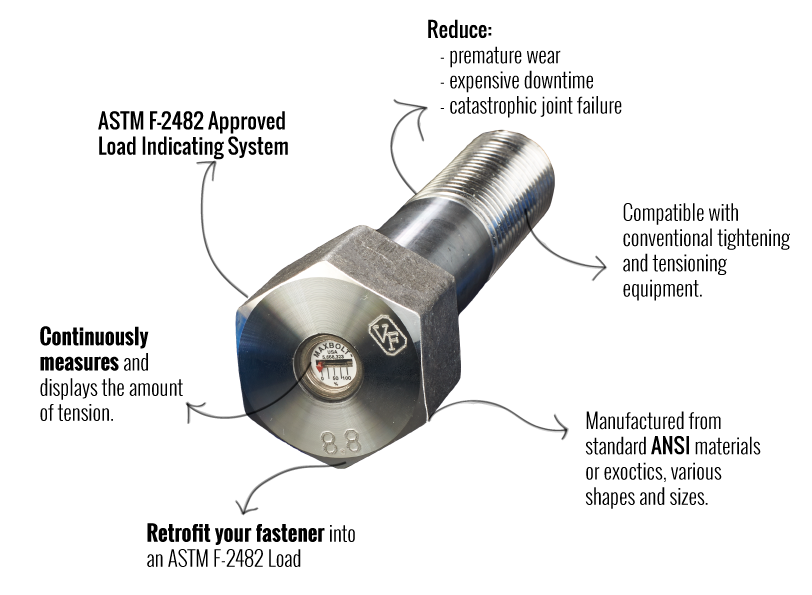 ASTM F-2482 approved Maxbolts™ offer a simple method for accurate joint assembly and is the only product available, for most applications, which will continually monitor clamping force while the fastener is in service.