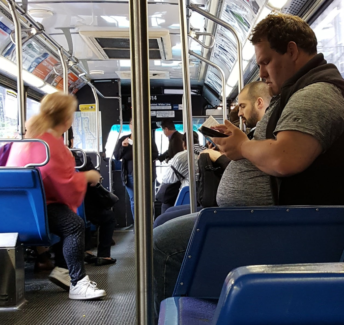 The rather ample gentleman on the right had an entire 2 liter bottle of Sunkist soda tucked under his arm. I can't even begin to fathom the decision-making process which terminates with "carrying a 2 liter bottle of soda with you as personal refreshment on your morning commute is a good idea." Total calories: 1,071.