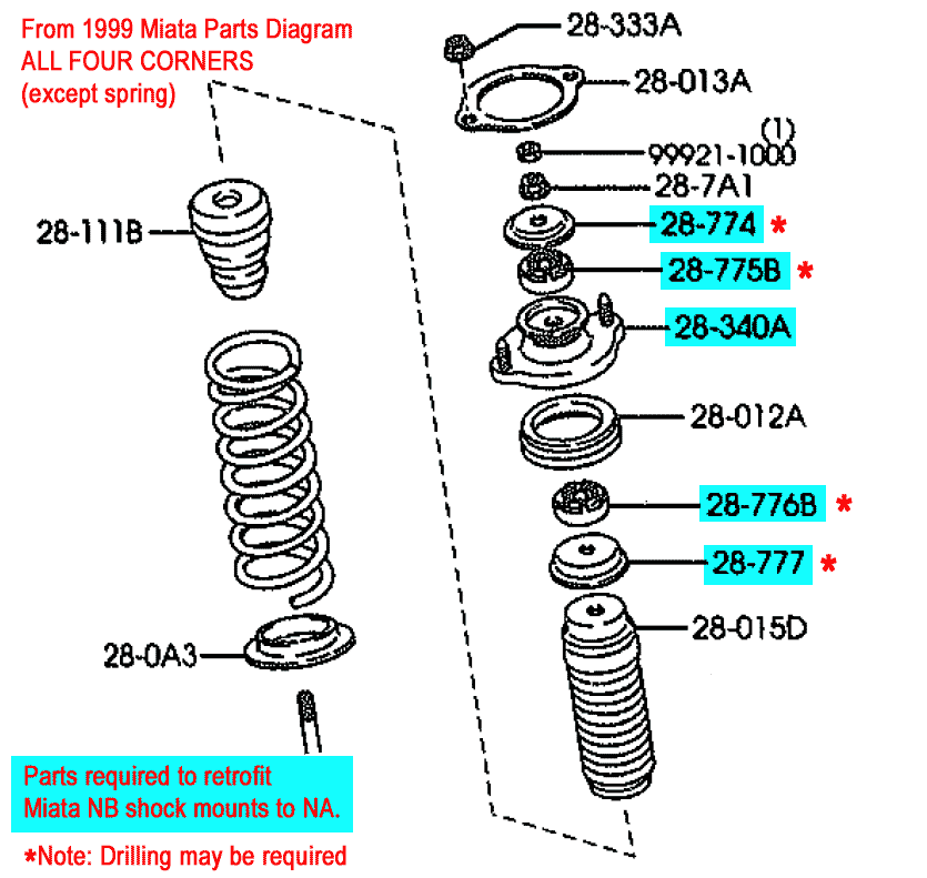 just be aware that the NA shocks have a much shorter shaft at the top and you'll have to cut down the two rubber bushings to get it even close. Most places that sell the NB top mount kits make a special nut that is really long and reaches down into the rubber where the threads end and has a shoulder to sit above the washer.