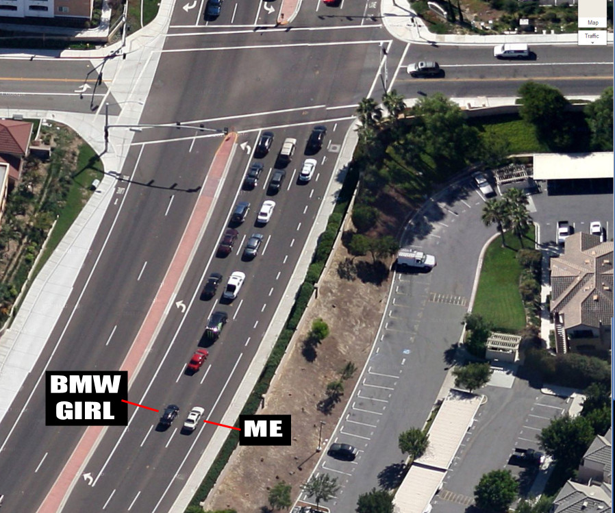 I was heading south on El Camino Real. I was in the right lane, and in the center lane, roughly keeping pace with me (~ 55 MPH), was a blue 3-series BMW convertible driven by an attractive young woman with red hair in a sort of bowl-cut.