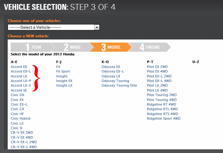 While your commitment to supporting the purchasers of American cars is charitable, the manner in which you have implemented such support causes minor but persistent annoyance to those of us who own automobiles not designed principally to confuse and confound their owners. I speak specifically to the database front-end which you have created which allows us to search specifically for parts which are applicable to our make, model and year of car.