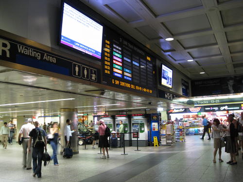 I recollect only an Amtrak waiting area on one side and stairwells down to the tracks on 2 adjacent walls, on on the 4th wall, the bathrooms, eateries, and the bar, where you can purchase an insanely expensive 8oz beverage while waiting for your train.
