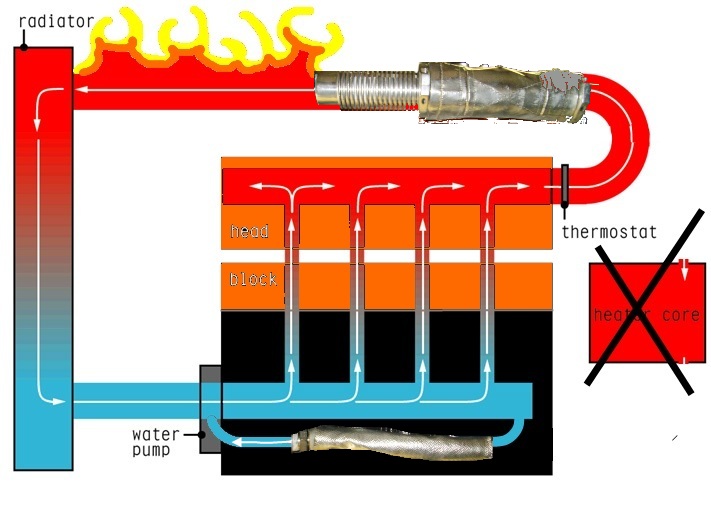 A machined pipe of aluminum is going to pull heat away?! water from the engine should be no more than 200F, yet exhaust temps are 300 at idle and sometimes upwards to a glowing 1000F under load in high horsepower engines, there is no way that the aluminum; a very good heat conductor (that means it likes to attract heat) is going to pull heat away from the coolant and transfer it to an area hotter than the coolant running inside of it.