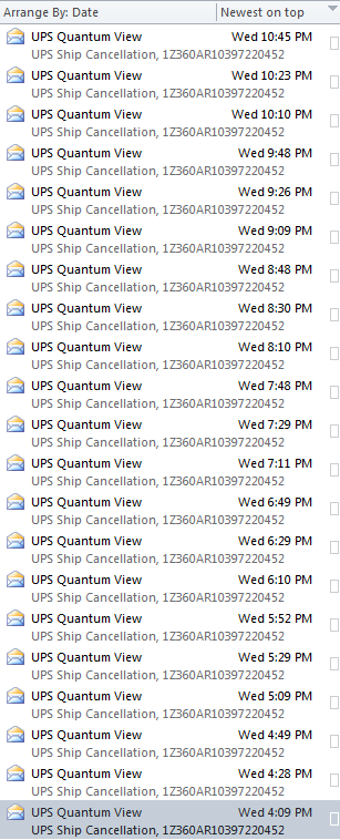 Between 4 PM and 11 PM, UPS sent me TWENTY ONE email notifications alerting me to the fact that my shipment had been canceled. The notifications rolled in roughly every 20 minutes for 7 hours, each one identical to the last.