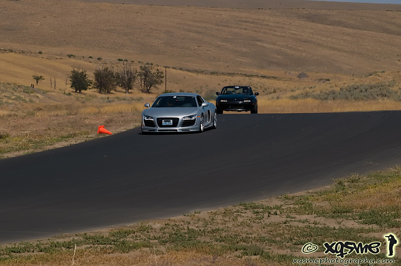 Here's the R8 that was running Monday. Supercharged to 540hp, reworked brakes and r-comps, it was trailered to the track. Guy had a crowd around the car and talked a good game in the AM. By lunch everyone was spending more time around my Miata. The R8 was my bitch. If I were him I'd commit sepuku or sell the R8 and buy a Prius. I was running quicker than any car but a full race 350hp 944 with a very experienced racer behind the wheel. I'm not so talented but that track is perfect for smaller cars that handle well. Me coming in for the kill...
