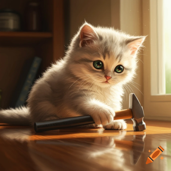 And here is an AI-generated image of "a cute kitten holding a hammer"