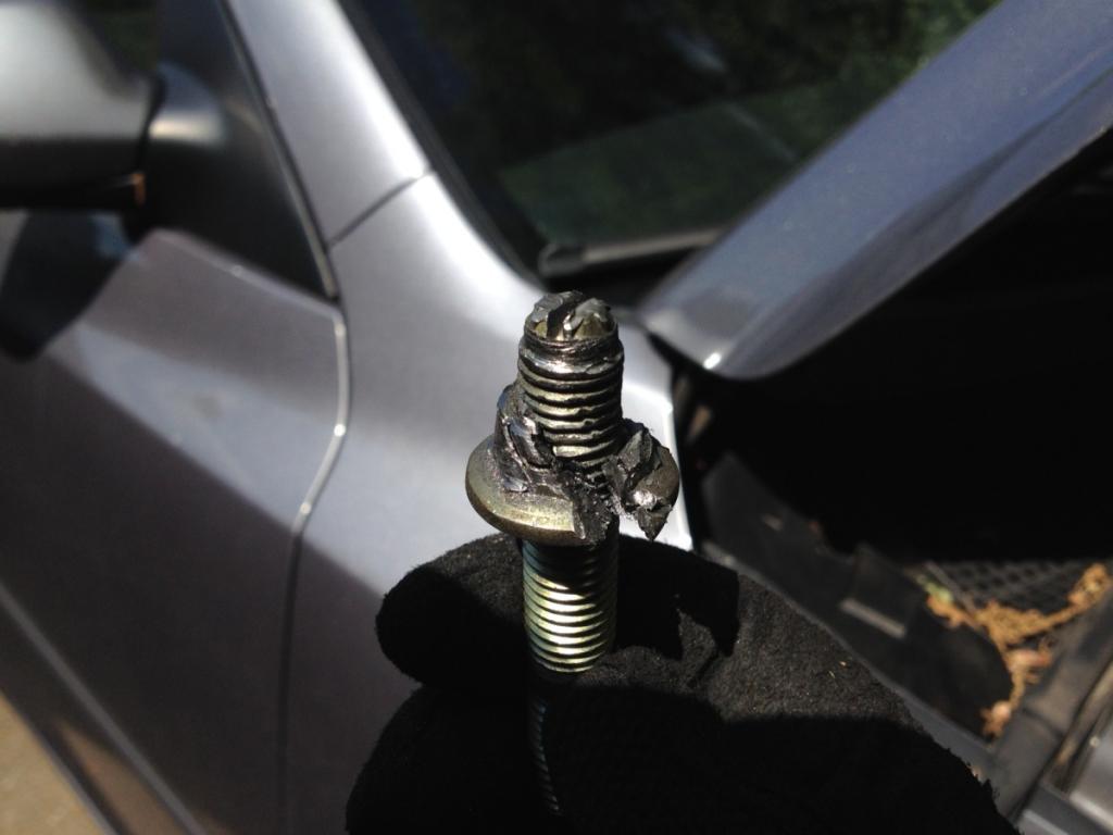 Then I took the dremel to the (now-flat) top of the stud, cutting a deep groove. I attempted to turn the stud with a large Craftsman flat-head screwdriver. The blade of the screwdriver is now twisted a good 20-30 degrees from its original position, and the stud didn't move.