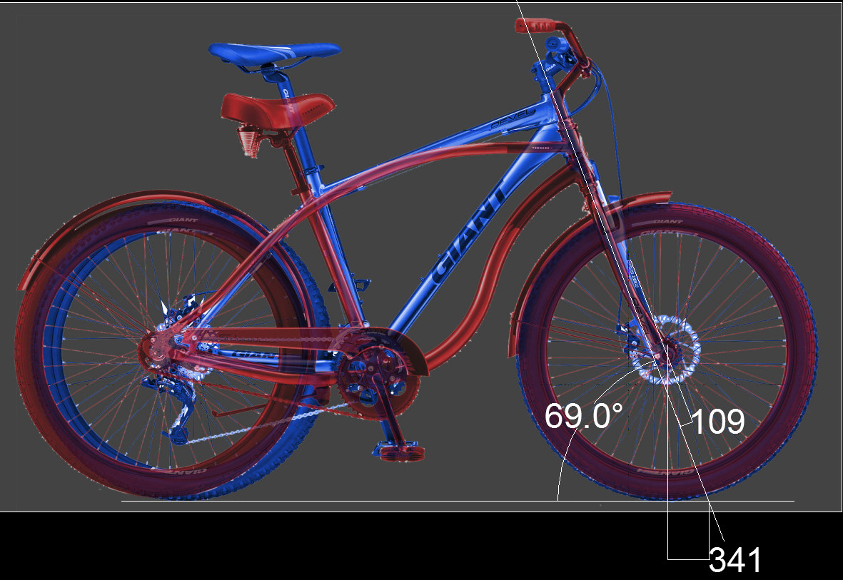 Obviously, the fork on the Giant is longer (when fully extended) than the Schwinn. So I create another composite, rotating the Schwinn's frame around the rear axle until it aligns with the Giant fork, then tilting the Giant fork to re-align it with the Schwinn headtube: