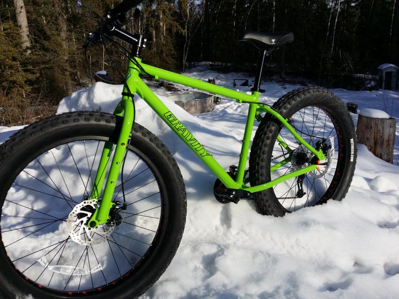 Bought Bikes Direct 2nd cheapest FatBike. Had to get the neon green, looks great. (dont mind the red alloy bolts - I had some leftover so I threw them on) For the price of $500 US the thing is quite nice. Welds and frame seem good, paint is a bit fragile (checked brake bolts and some paint popped off). Picked it up after being in the US for a week and so no shipping, customs or duty. Not a bad way to buy a bike and I’d do it again. BD business model works well and the bikes are specc’d good for the price. If you’re not pro these China bikes are a great way to do it. Up here the cheapest FB is $1100 CDN, probably because of the hype still around them. The studded fatbike tires are something north of $200 each – and they are not even Hoosiers……eventually the hype will die down but I jumped on the cheap bandwagon for now.