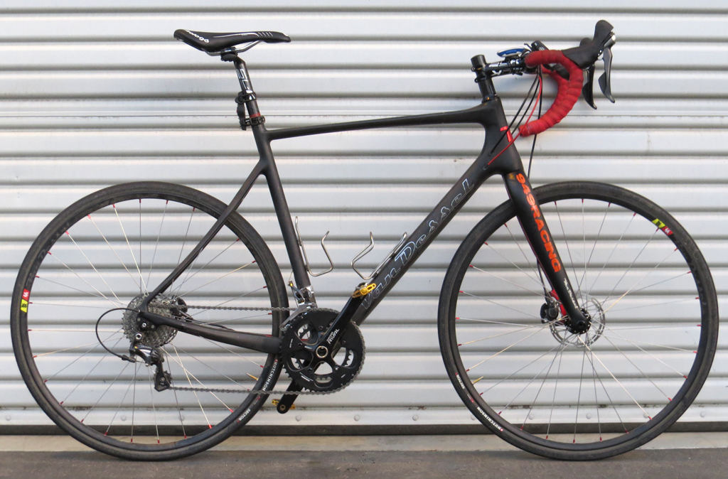 Fiddled with a 1x11 setup but gave up. Bough a cheap SRAM Rival 180mm 50/34 crankset. Paired with an 11/32 cassette and I have enough gear for just about anything. 28.4 gear inches plenty low for grovelling up 15% grades at mile 120. Lowered the bars 5mm from cross position, more road friendly and aero.