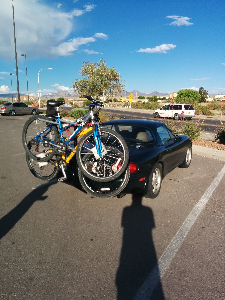 I got sick of using the trailer for the bikes, so I made a bike rack for the hidden hitch. Note the wife's sub-Joe Perez priced Schwinn bike.
