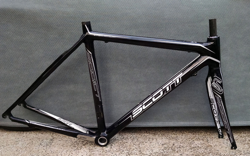 Well, I couldn't stand it any longer - been wanting to do a lightweight build for a long time. I picked up an '09 Scott Addict SL this week. Too nice to pass up, and it's a proven platform for this type of build. The frame came in right at 800g, and the fork at 285g (with the crown race). I'm aiming to end up in the 10-12lb range when it's said and done, but I have a feeling this will be a bit of an ongoing build.