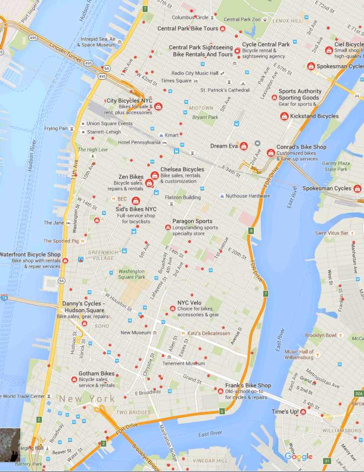 There are dozens of bike shops in NYC, maybe hundreds. The crappy ones don't survive. This is just the lower half of Manhattan, which is just one of the five boroughs. Don't just look at the named spots, look at all the little red dots whose names don't even fit on the page: