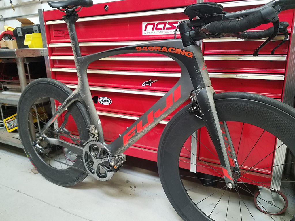 After a 20K TT a few weeks ago. Monsoon the night before, sand and puddles all over the course. Set my PR at 27:37. Looks like I did a mountain bike race. I have an aero jacket (disc cover) for the rear wheel, just building a new set of 88mm clinchers to put them on.