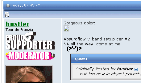 I have to be honest here. I'm genuinely offended by this business of "let's spend thousands of dollars on fancy bikes which are of no practical value as daily commuter machines." I mean, for a forum which is principally about cheap cars, this is basically the two-wheeled equivalent of I own a Bugatti Veyron which I rub with a cloth diaper every night and drive twice a year dot com.