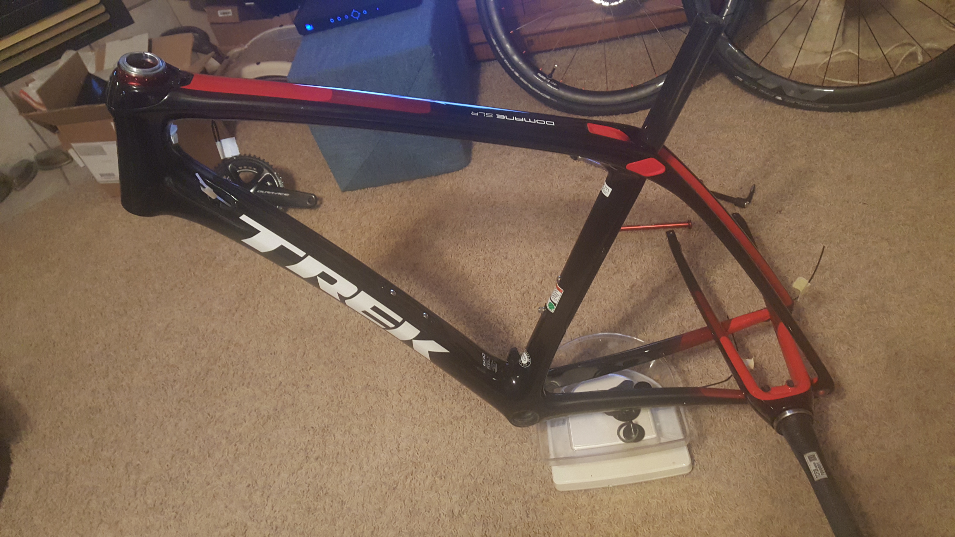 Been collecting parts for new road bike. Finally got the big part. 2018 Trek Domane SLR Disc frame and fork. All I have left to get is some Di2 wiring, junctions and battery. Frame and fork and headset is listed as 1900 grams for a 56cm on web. Quite surprised to see it weigh just 1740 wonder if they lightened it for 2018 and never updated the info.