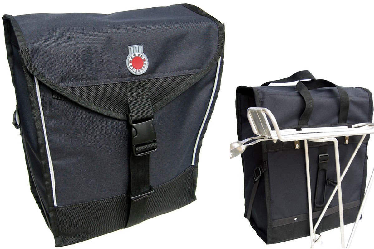 That rack serves as the foundation for whatever cargo system you want to hang. You can install collapsible wire baskets, or you can use it for a detectable cargo system like the Banjo Brothers Market Pannier. This is what I use, and it's great because you can clip it onto the rack and ride, then pop it off, extend the shoulder strap, and take it into the grocery store like a massive man-purse. You put the groceries into it as you're shopping (in lieu of a basket or cart) and then after you check out, you clip it right back onto the frame.