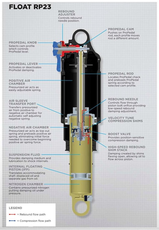 The other is a nitrogen charge that pressurizes the oil in the damper side. This is filled by fox at the factory using a nitrogen needle that goes through the little hole inside the 4mm allen set screw thing you just undid (see 'nitrogen chamber' in the diagram). The damper won't work well without that charge.