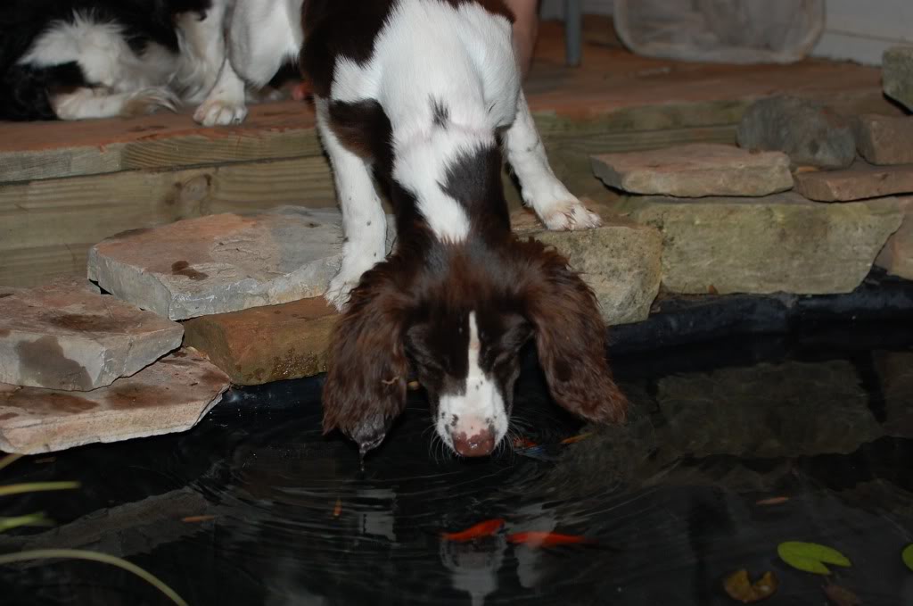 This is Gibson, my 6mo springer spaniel. She just recently noticed the goldfish in the pond. Now she'll stick her paw in the water to attract unsuspecting fish, then try to eat them.
