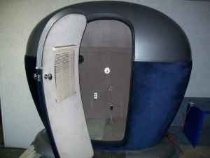 It is wired for power, sound, data, and even phone (how quaint). It housed a CRT screen, ventilation fans, the best computer of its day, 4 speakers converted for use from a car audio system, mood lighting and a Captain's Chair. Long Term CRT particle bombardment in an enclosed space took its toll. The Egg of Solitude is now in disrepair. It awaits a new visionary. One who is versed in modern available technonogy and has a few friends who know how to build stuff and work on car interiors and wire stuff up in such a way that doesn't lead to electrocution. Such a visionary could possibly visualize a full gamers chair, 36+ inches of flat screen, surround sound, lighting effects, maybe even a small frige (definitely a cooler).