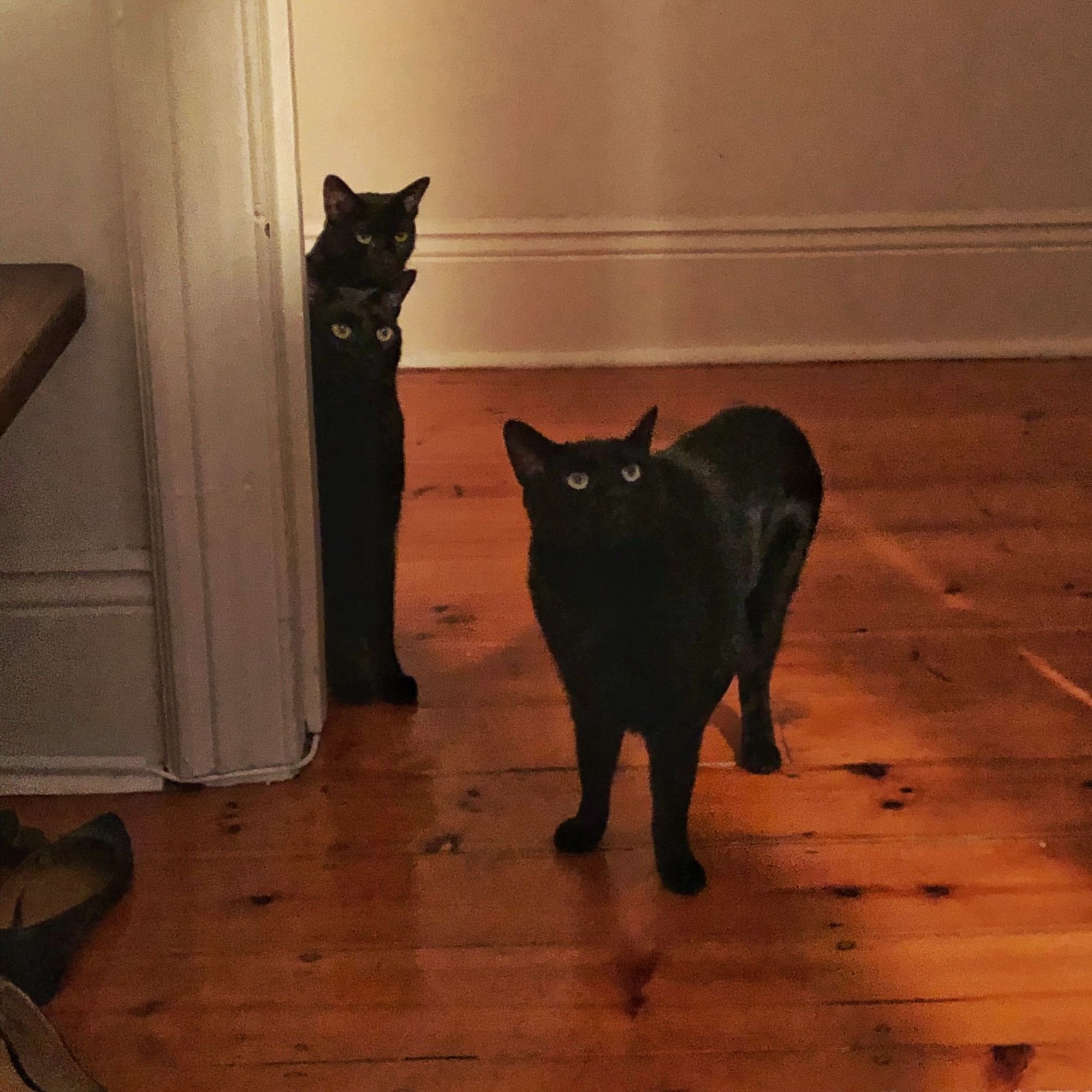 We made Oscar and Felix a cardboard cat cottage from our amazon boxes. And yes, they use the front door, but I left the other gable open (in case of fire).