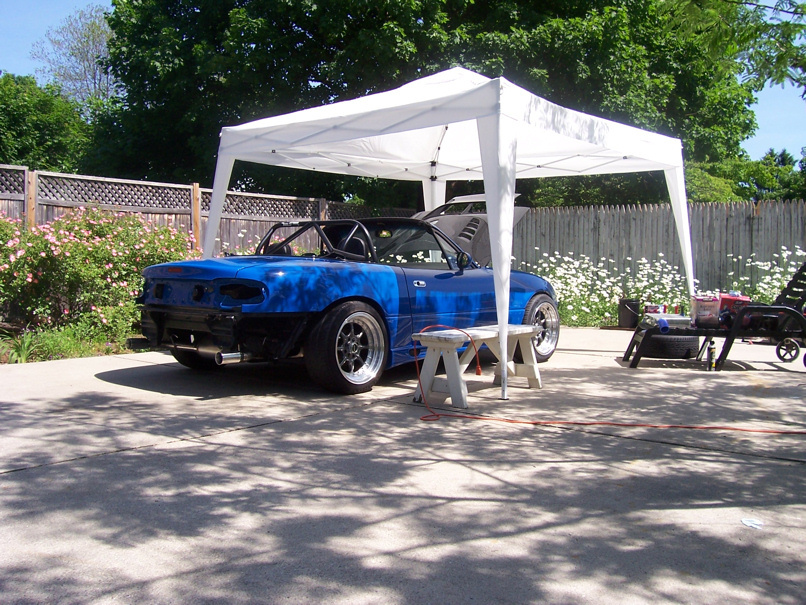 So I'm living with my parents right now, they just built a gorgeous house that's awesome, heated hardwood floors, great scenery, media room with 5.1 surround and projector, huge kitchen, the works. Unfortunately they didn't have enough money to build a garage. Thankfully, they're awesome parents and bought me metal tube/canvas car park to put my tools, miata, motorcycle, and quad in. (yes, it all fits.) It not the best, but it worked, every once in a while I'd have to pull out a vehicle or two to work on another, but I got the job done. My dad and I laid a couple 4x4's down and a bunch of old tongue-and-groove board on top of those for flooring, it was actually a nice setup.