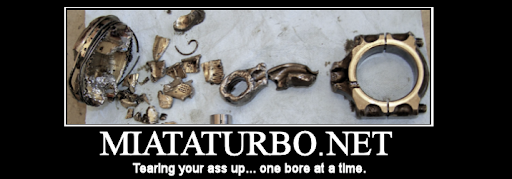 I am all for the bent rod t-shirt idea. It has humor, an inside joke, and an iconic tidbit of what happens when you get carried away with the Miata boost. What about something like my old sig image? It covers the above, plus the Miatas are gay aspect, plus some vulgarity for a touch of mt.n irreverence. I love irreverent humor.
