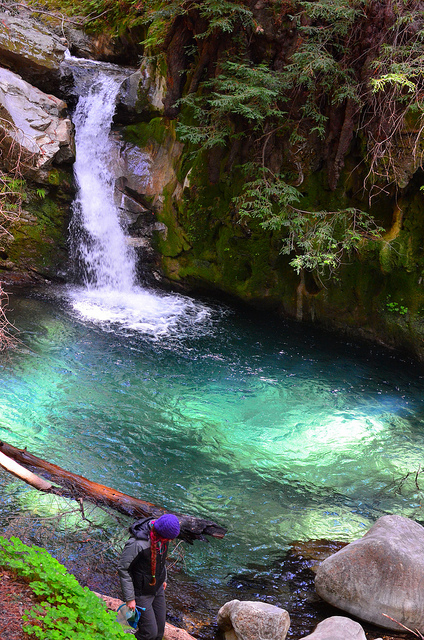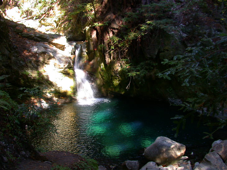 That rock wall on the right with the moss on it has a spring that flows out of the limestone, separately from the waterfall. When the falls go dry in the summer, water continues to leak from the mountain year round. Unfortunately, that location is about an hours hike into the backcountry from highway 1 in Big Sur, and water weights about 8.3lbs/gal. Humping 66lbs of water through that country would probably kill me at this point, but I can still dream.