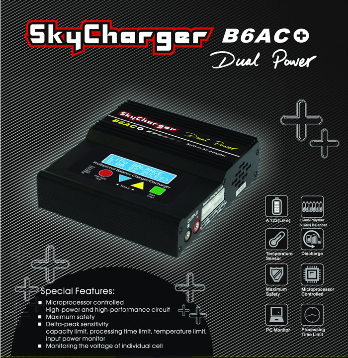 Sky Charger B6AC 6-in-1 DUAL POWER Balance Charger/Discharger w/ AC Adapter for 1-6 Cell Lipo/Lilo/LiFePo4 + 1-15 Cell Nimh/NiCD w/ USB PC Charging/Monitor Software