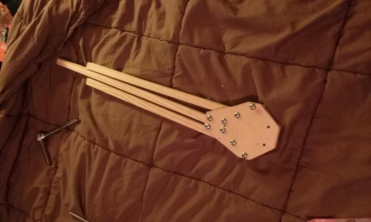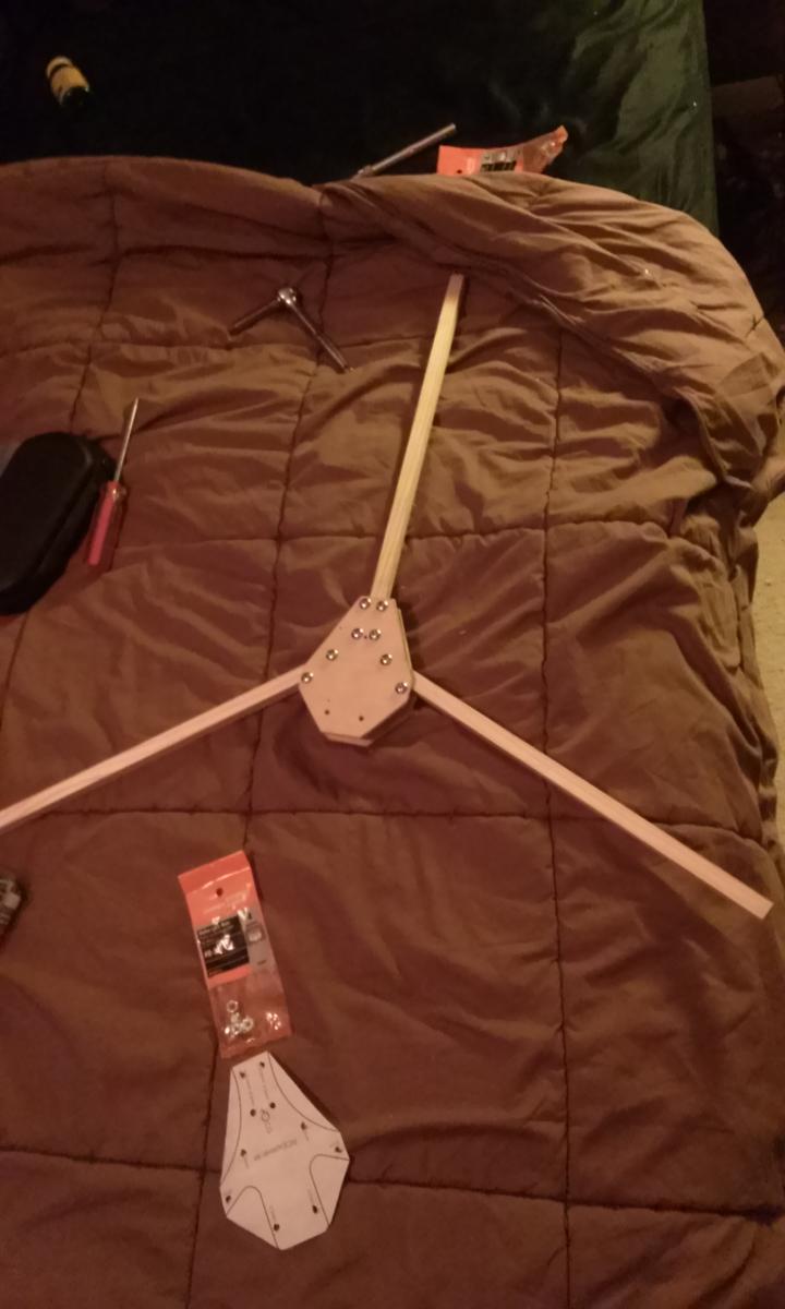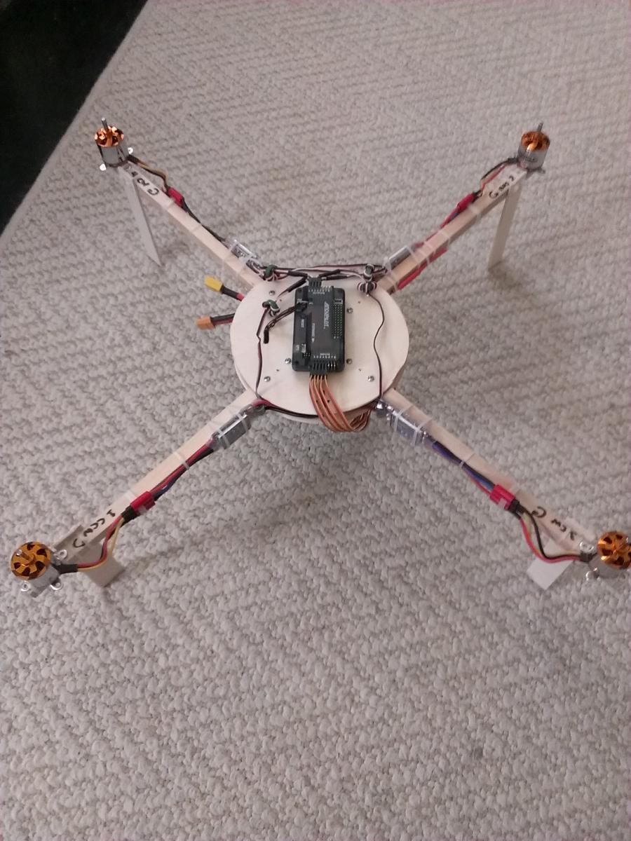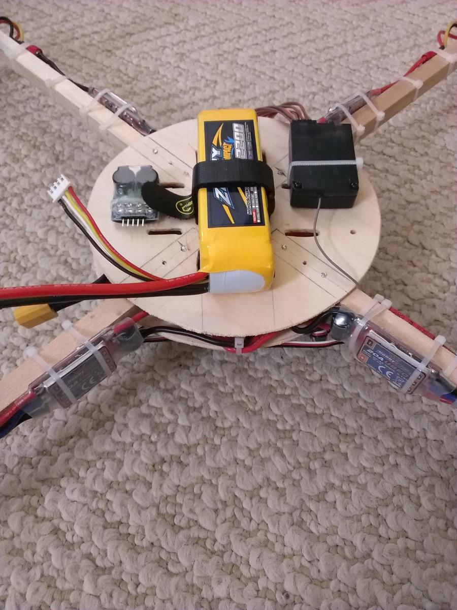 Top and bottom plates are around 6" dia 3mm hobby plywood from ACE Hardware held together by 3/4" 4-40 machine screws, no nuts. I just drilled undersized and force threaded them through the wood. Booms are 1/2" square dowel and its like 23 or 24" motor axle to axle. GemFan 1045 & Turnigy D2836/11 750KV motors hovers right around 1/2 stick and is remarkably stable. AUW is around 945g IIRC.