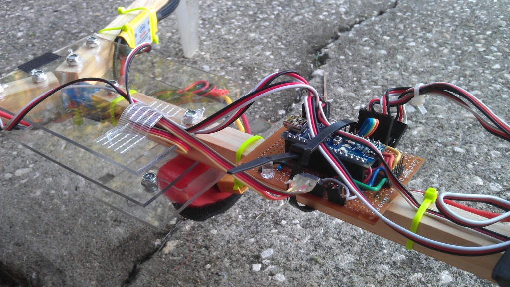 Bottom: 2200mAh S3 35C LiPo, receiver, low battery alarm. I cut a bunch of extra slots for different battery configurations. I need to move the antenna off the arm lest it get ripped out if the arm ever detaches.