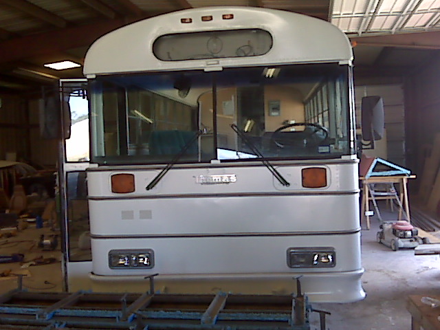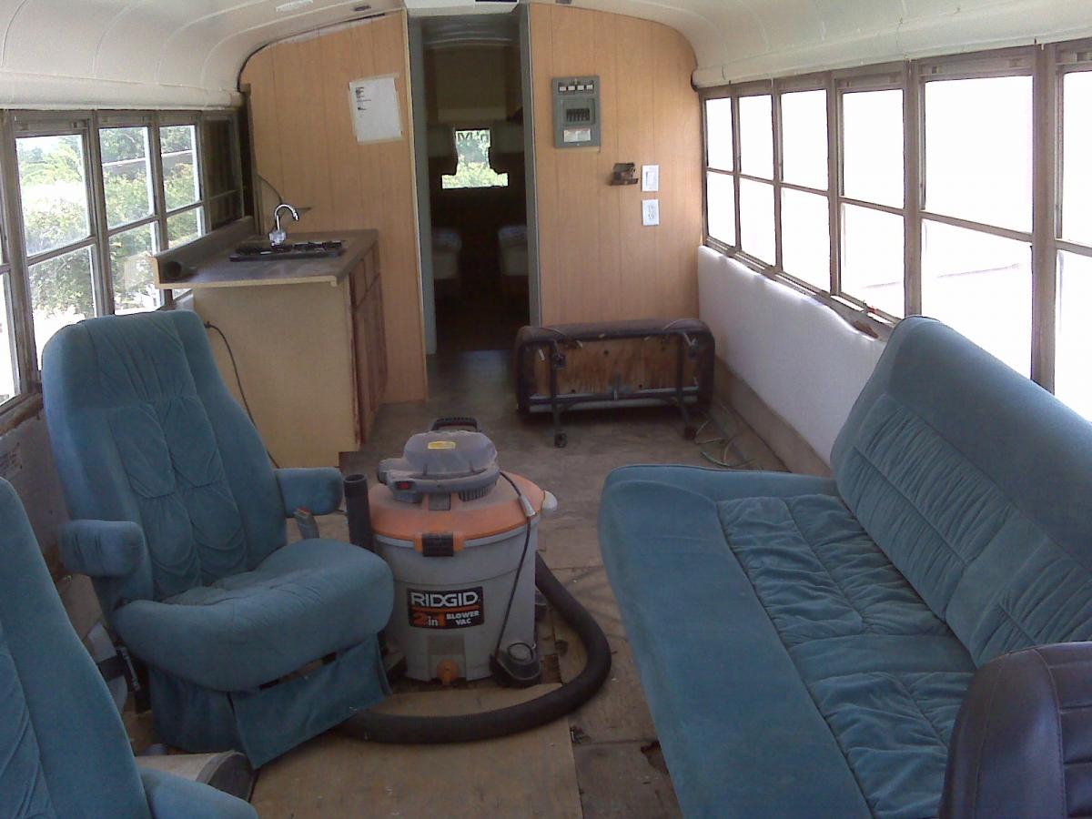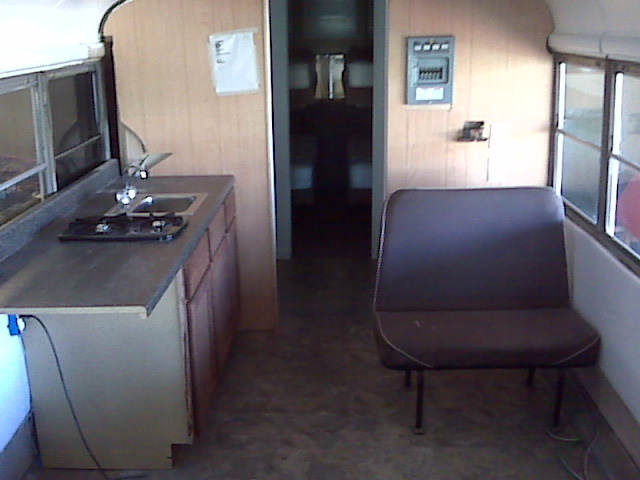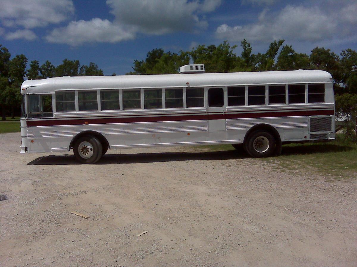 We resprayed it the original paint job it had when it was still in service at A&M and tore out the inside. There is now a bedroom, complete bathroom with a toilet and shower, kitchen with stove and fridge, and a living room. A 6500W generator was mounted under the bus and a 15000btu roof mount a/c was installed. We may have to install an additional 13500btu unit, but we will see.
