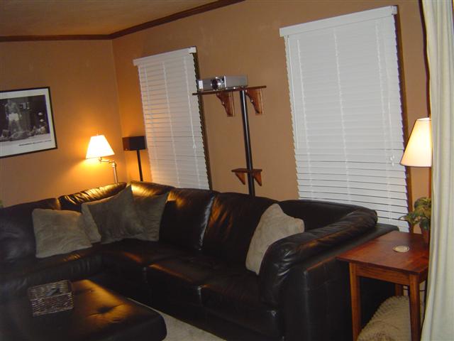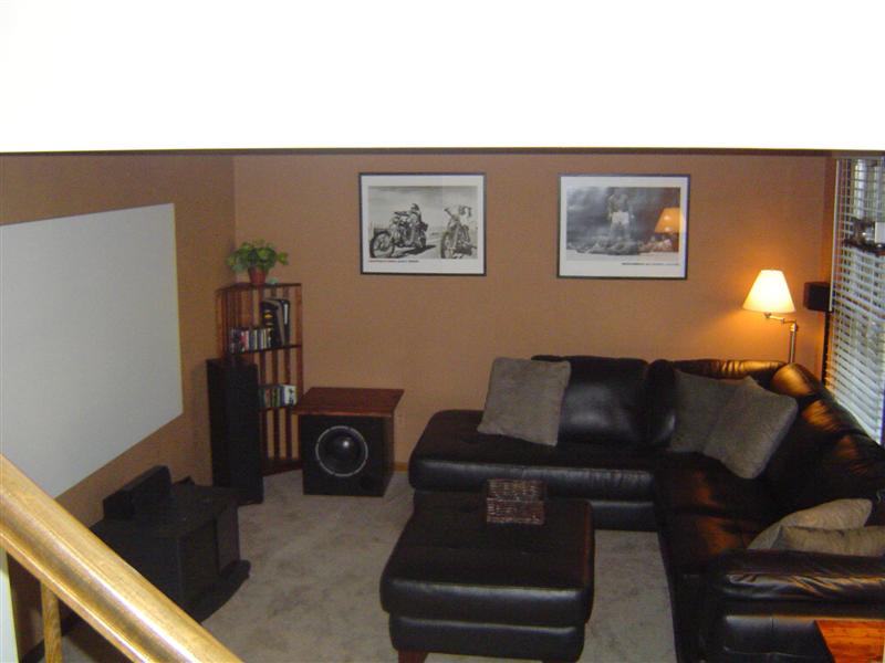 Room is 15'x20', Love seat against one wall with 37" LCD hanging above (behind my head) it. On the opposing wall is the screen with projector in the middle of the ceiling. To the right of the love seat is a closet - I cut the wall out and made a shelf system to harbor all electronics. Wired all speakers when I installed the hard wood floors. Painted the wall with the projector screen in Flat Gun Metal Blue. In the middle of the room is a Brunswick pool table...cherry finish with Black felt (so light reflection isn't an issue).