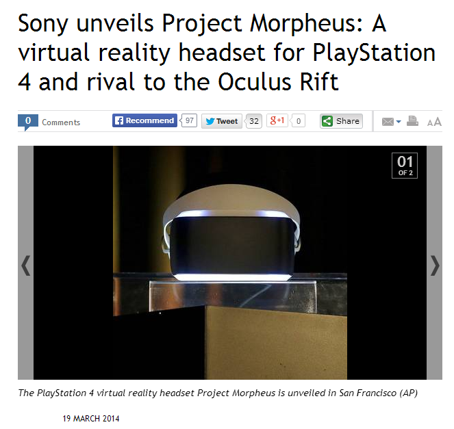 I honestly am more excited about the Sony product, though. There are more important factors than which display technology is better or who copied who. The simple fact is that the Sony product is in a much better position to deliver on the promise of truly immersive VR, since it's going into an environment which is already populated by handheld position-and-orientation-tracking controllers designed to move freely in three dimensions.