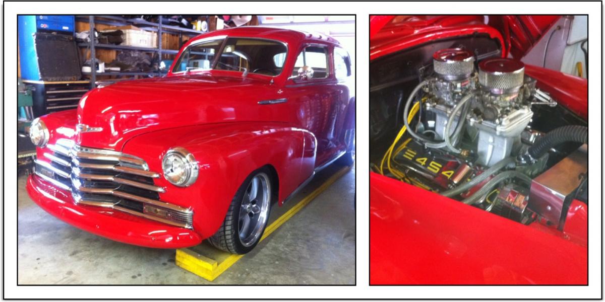 First off is my '47 Chevy Fleetmaster Sedan. 454 big block, dual quads on a tunnel ram, TH350 and a 9". Ostrich interior. Power steering on a camaro IFS clip. Great driver.