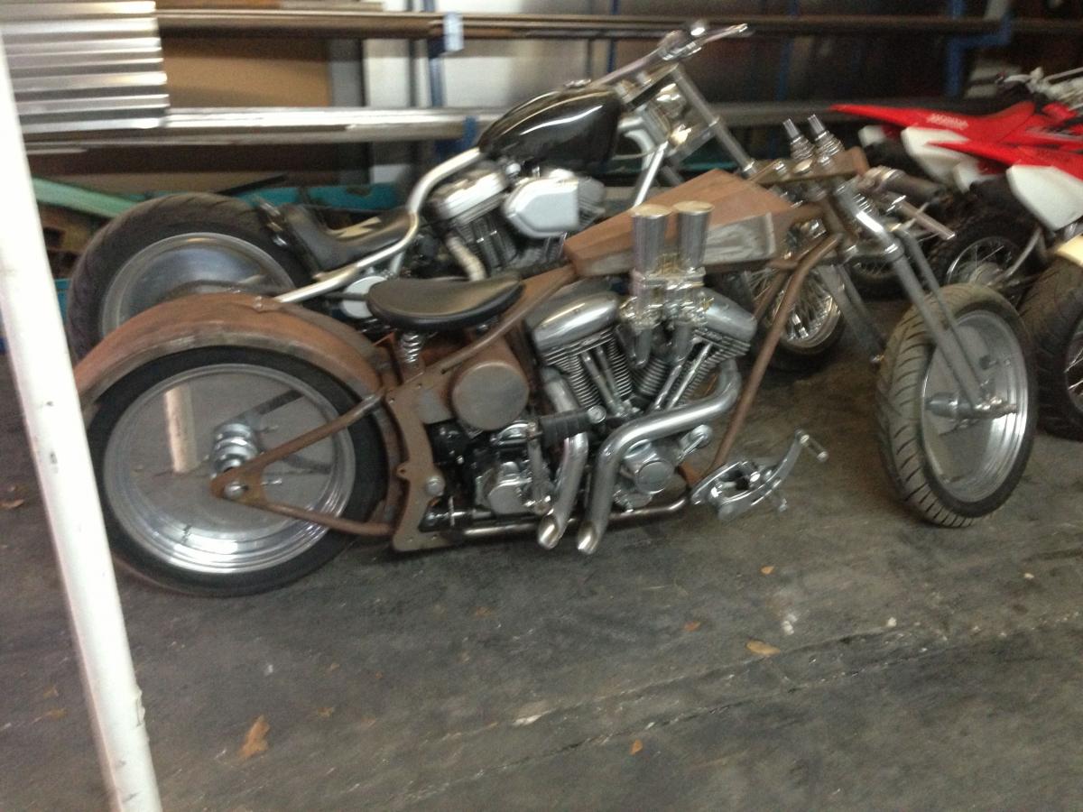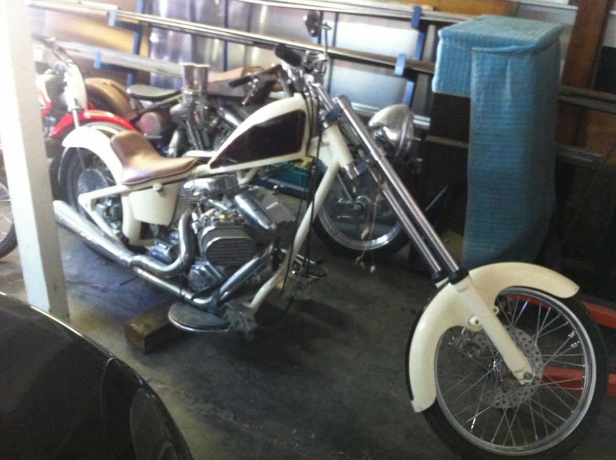 Then there are two choppers I've been building for a while. The white bike just needs wiring, the rusty one might get paint or might stay raw. I kinda like it raw..