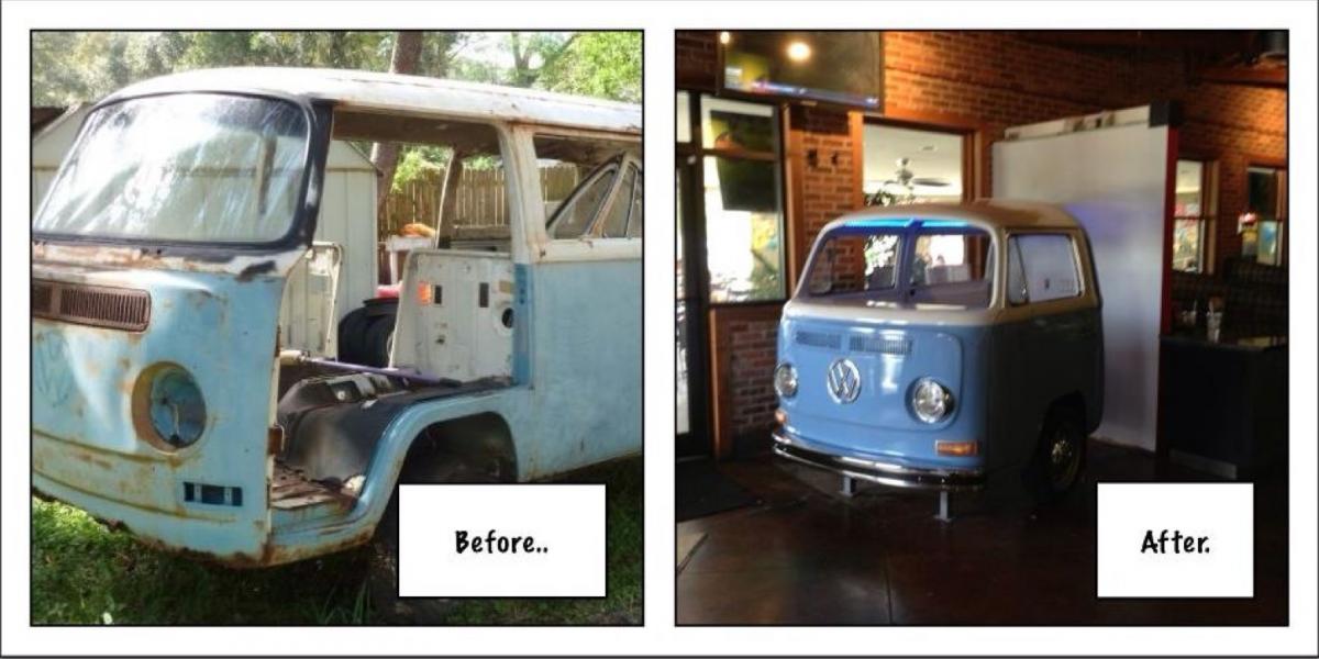One of the nicest parts about this client is he's a friend and knows how I work, and pretty much leaves me alone to do what I want. On the schoolbus he just said "I want a hippy bus", and left me to work out how to make it work and function in a restaurant. (With the bus that meant making a canopy out of the roof with bus end caps..)