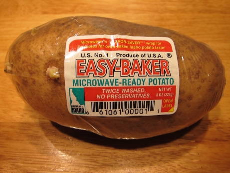 Seriously? A "microwave-ready potato"? All potatoes are microwave-ready; it's in their nature. But for some reason, someone came up with the idea that you can take a single potato, wrap it in heat-shrink, slap a label on it, and mark it up by 300%. And so far as I can tell, people are actually buying them.