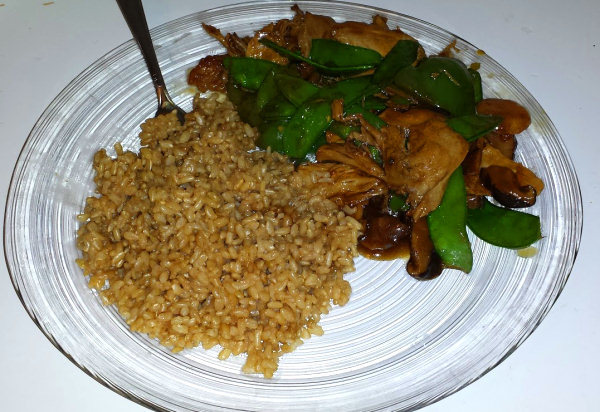 Also, I've been doing before-and-after dinner measurements as well. Before dinner (~6 hours after lunch), a typical reading is around 90. One hour after a reasonably-sized plate of the aforementioned cuisine (from the last post), range will be maybe 120-130. This is higher than the one-hour-after measurement of a completely carb-free, sugar-free meal, but not massively so. I conclude that my body has no quarrels whatsoever, in this regard, with a big plate of mango chicken and brown rice.