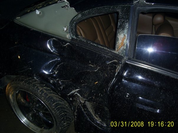 Next thing I knew we went up the curb and the back left side of the car clipped a power line pole which sent the car sliding to the right some where we took a tree completely out and then collided head on with another tree. Estimated speed when hopping the curb was between 40-47 mph. We hardly slowed down at all on the grass since it was so wet/slick. The pole really didn't slow us down at all cause it was a small clip.