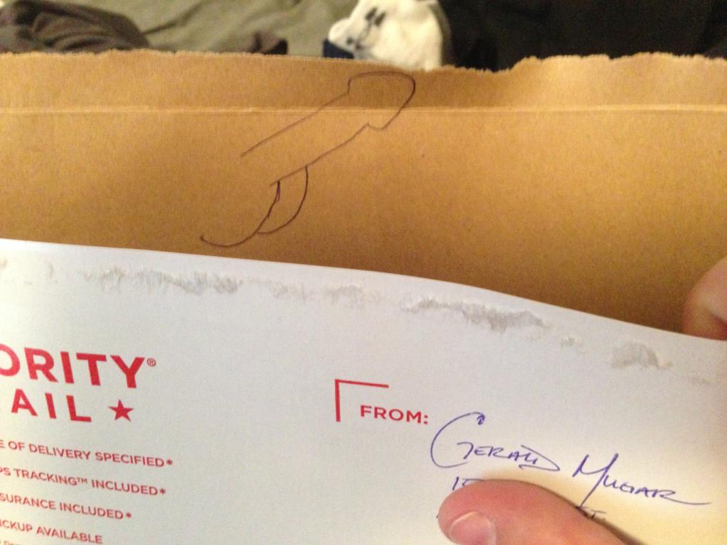 This thread needs some action. Its not much, but Gerald got me with a subtle dick on the inside of this flat rate USPS envelope.