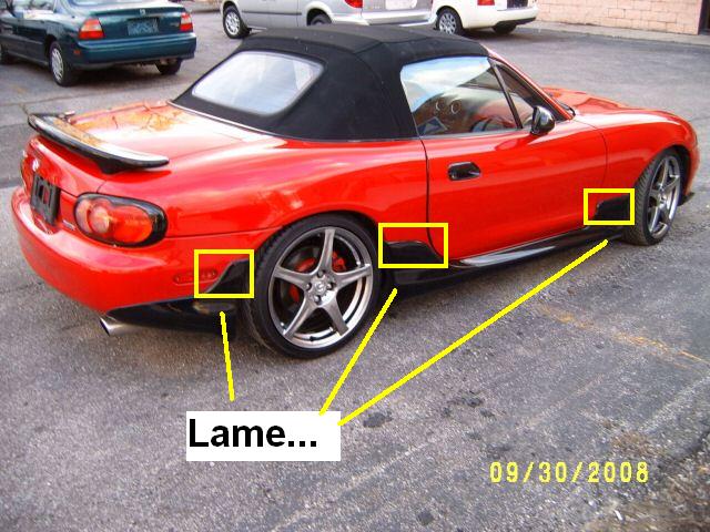 I see the look the guy was going for. The black-framed lights are fine, and the black spoiler/mirrors/door-handles carry that theme through OK... but he paints the black up too high on the body kit. As the body-kit pieces curve upwards at the fenders, it needs to stop... which means either buy some aftermarket valences that actually stop, or don't paint them.