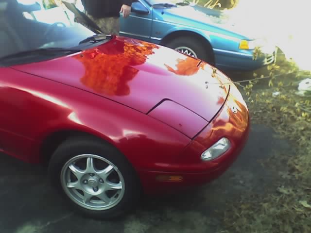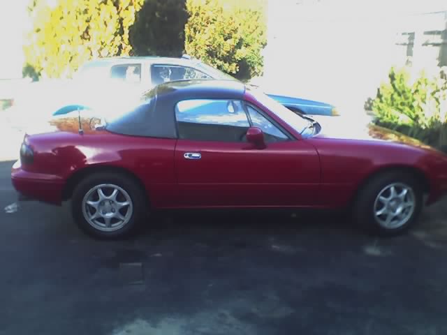 Picked up another miata today guys 1996 tan leather 5 speed 103K miles. for 4k on the raod this thing is pretty sweet i think my lil sis is gonna love it. After driving it home i felt that leather seats might be a good adition to me miata in the future anyway heres a pic of wearing my hardtop as the soft top isnt as good as the one i have but this gives mea chance to off load my never used soft top on my sister. gotta love that weight reduction bonus.