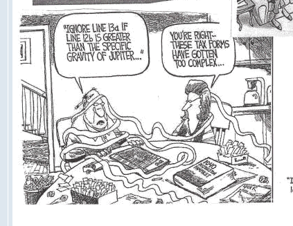My Federal tax package for this year consisted of Forms 1040 and 2210, Schedules A, B, C, D and SE, and Publications 463 and 1542. And even that wasn't exactly difficult. No calculus, no linear algebra, just a bunch of simple fixed-point addition and subtraction. Basically mathematics at a second-grade level.