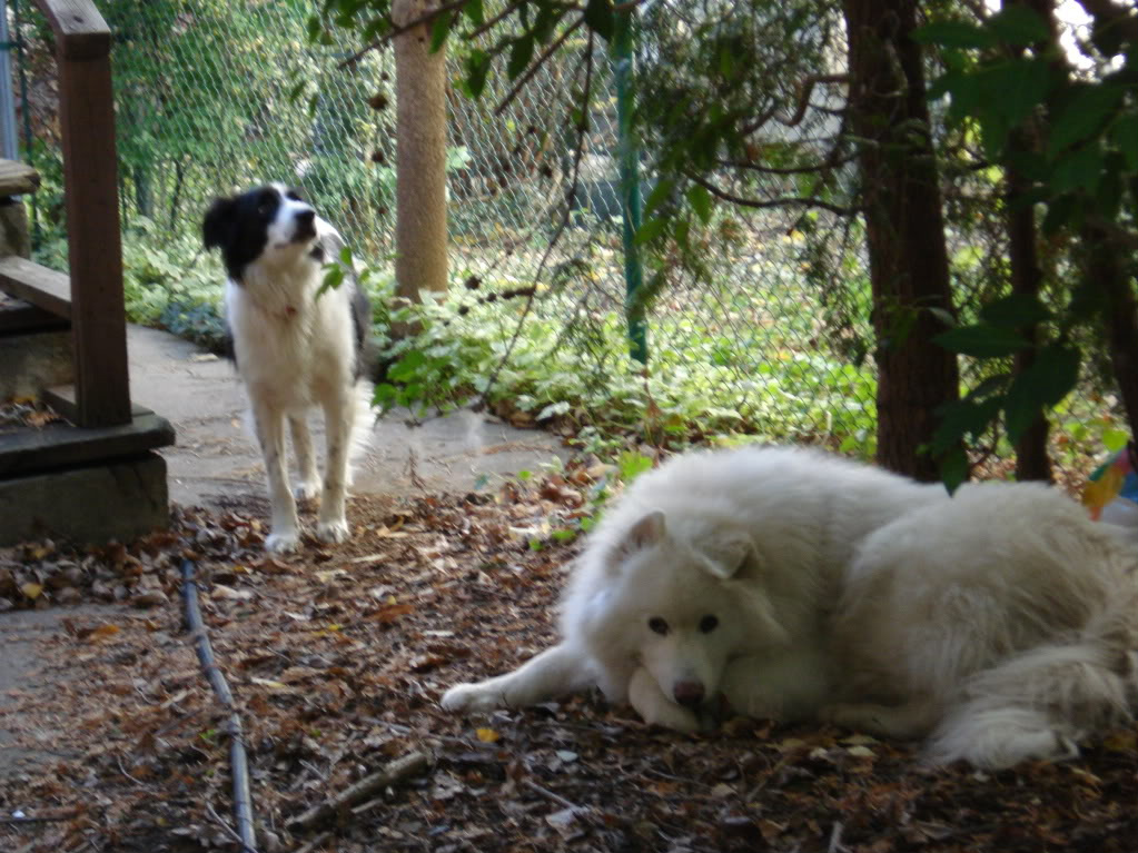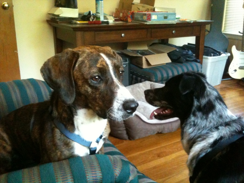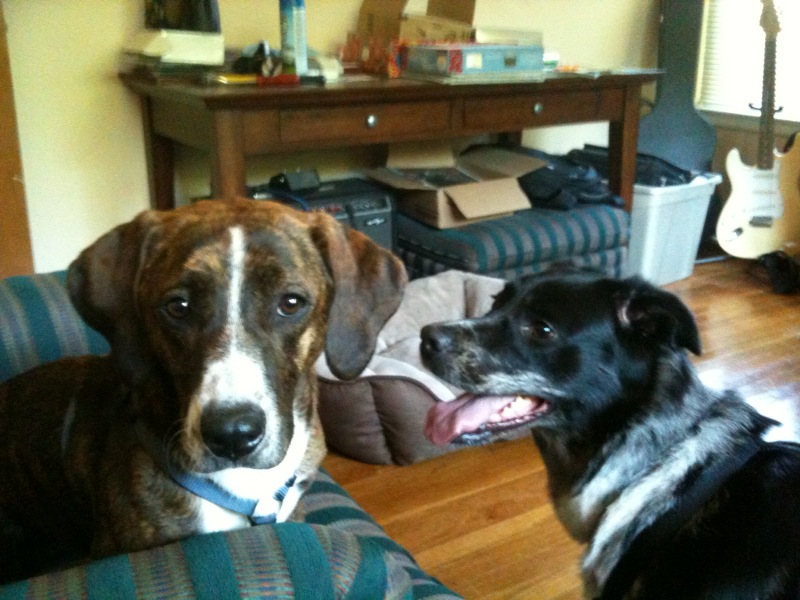 Claire (left) is a rescue bassett/boxer/lab mix - 18 months old, a little skittish but adjusting well. And Miley (right) appears to be blue heeler and border collie. I got Miley from a family member who recently split with his wife, travels too much for work, and has grown kids who don't want a dog. Anyhow, these two have hit it off well so far, and I think they'll make a good pair...